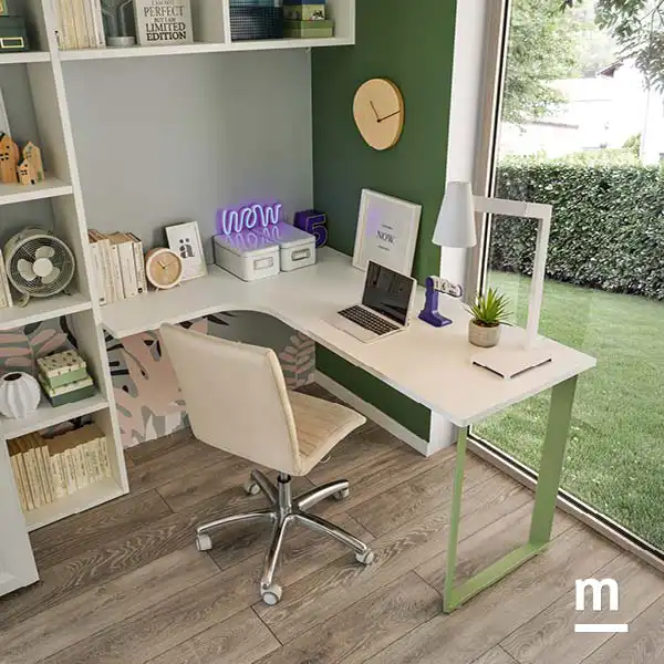 Чтобы сконцентрироваться во время учебы, вам понадобится хорошо оборудованный рабочий уголок. Примером может служить этот угловой письменный стол, поддерживаемый с одной стороны стороной Form из лакированного металла и упирающийся в настенный книжную полку с другой стороны. Столешница выполнена в светло-белом цвете и благодаря большой поверхности обеспечивает максимальный комфорт для тех, кто учится, оставляя под рукой место для всего необходимого.